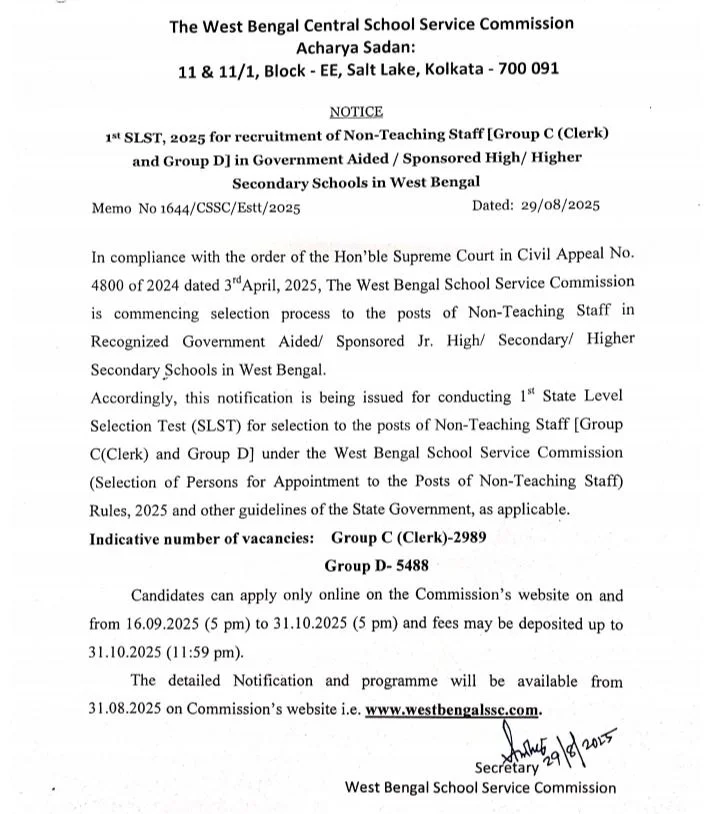 wbssc.gov.in West Bengal School Service Commission (WBSSC) WBSSC Group C, D Recruitment 2025, Eligibility, Fee, Last Date, Apply Online, WBSSC has released the new notification for the recruitment of WBSSC Group C (Clerk), Group D (Peon, Laboratory Attendant, etc.) New Vacancy 2025 for 8477 Posts, WBSSC Non-Teaching Online Registration Form 2025 has started from 03 November 2025 to 03 December 2025 through the official website of the Authority. The candidates who are interested for WBSSC Group C, D Bharti 2025, Kindly read the full notification related to WBSSC Group C, D Jobs 2025. Check Eligibility, Application Fee, Age Limit, Salary, Selection Process and all other information, All the details related to WBSSC Group C, D Online Registration Application Form 2025 Link is given below.
