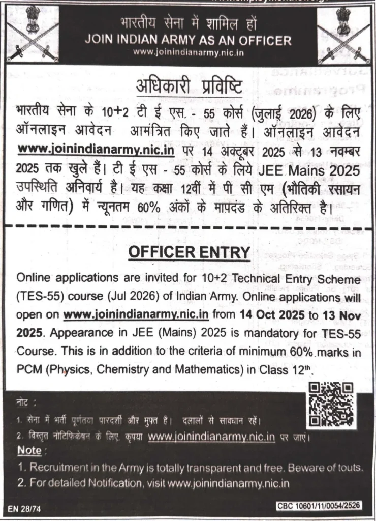 joinindianarmy.nic.in Join Indian Army Army 10+2 TES 55 Recruitment 2025, Eligibility, Fee, Last Date, Apply Online, Authority has released the New Notification for the recruitment of Army 10+2 Technical Entry TES July 2026 Batch Scheme TES 54 Entry Post New Vacancy 2025 for 90 Posts, Army 10+2 TES 55 Online Registration Form 2025 has started from 14 October 2025 to 13 November 2025 through the official website of the Authority. The candidates who are interested for Army 10+2 TES 55 Bharti 2025, Kindly read the full notification related to Army 10+2 TES 55 Jobs 2025. Check Eligibility, Application Fee, Age Limit, Salary, Selection Process and all other information, All the details related to Army 10+2 TES 55 Online Registration Application Form 2025 Link is given below.