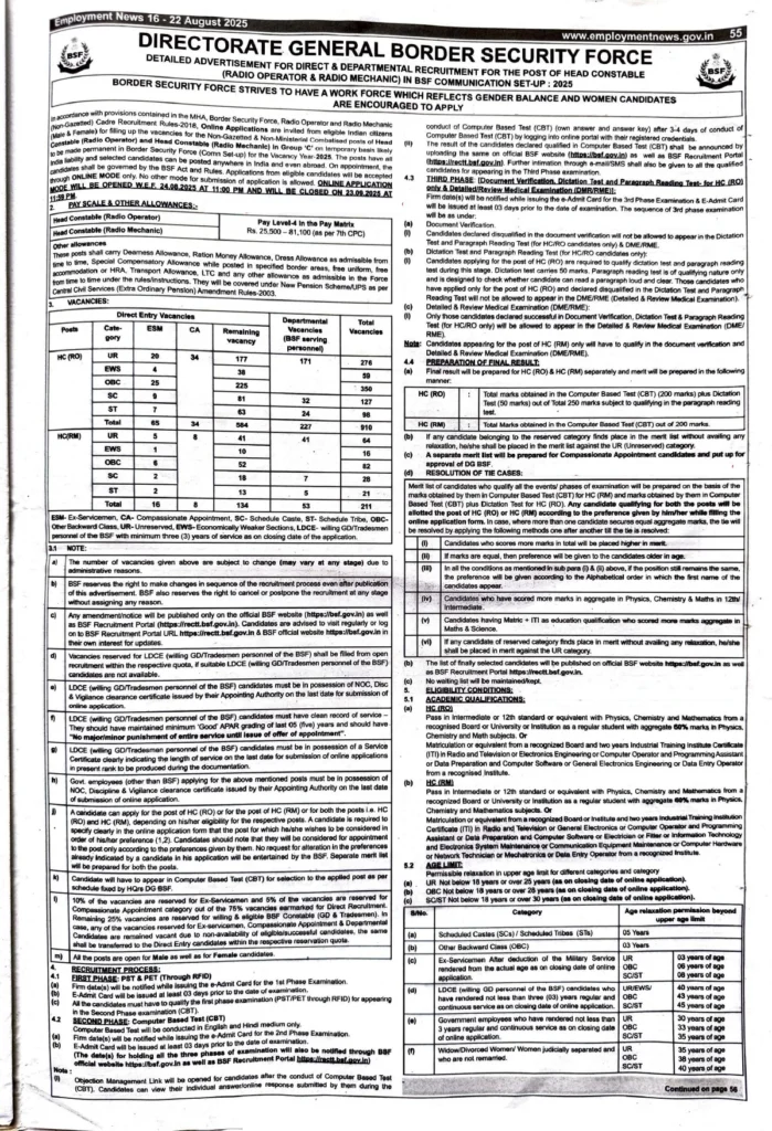 | BSF Head Constable Radio Operator (RO) Vacancy 2025 | 910 | 10th Exam Passed OR Equivalent & 2 Years ITI in Radio & Television/Electronics/ Computer Operator & Programming Assistant /Data Preparation/etc. OR 12th Passed OR Equivalent with Physics, Chemistry & Mathematics OR Equivalent Eligibility From Any Recognized University/ Board/ Institutions in India. |