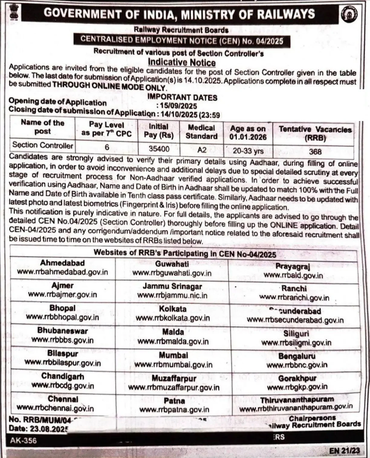 indianrailways.gov.in Railway Recruitment Board (RRB) RRB Section Controller Recruitment 2025, Eligibility, Fee, Last Date, Apply Online, RRB has released the new notification for the recruitment of RRB Section Controller New Vacancy 2025 for 368 Post, RRB Section Controller Online Registration Form 2025 has started from 15 September 2025 to 14 October 2025 through the official website of the Authority. The candidates who are interested for RRB Section Controller Bharti 2025, Kindly read the full notification related to Railway RRB Section Controller Jobs 2025. Check Eligibility, Application Fee, Age Limit, Salary, Selection Process and all other information, All the details related to RRB Section Controller Online Registration Application Form 2025 Link is given below.