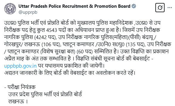 4543 Post For more complete information please read the UP Police Sub Inspector SI Notification. |